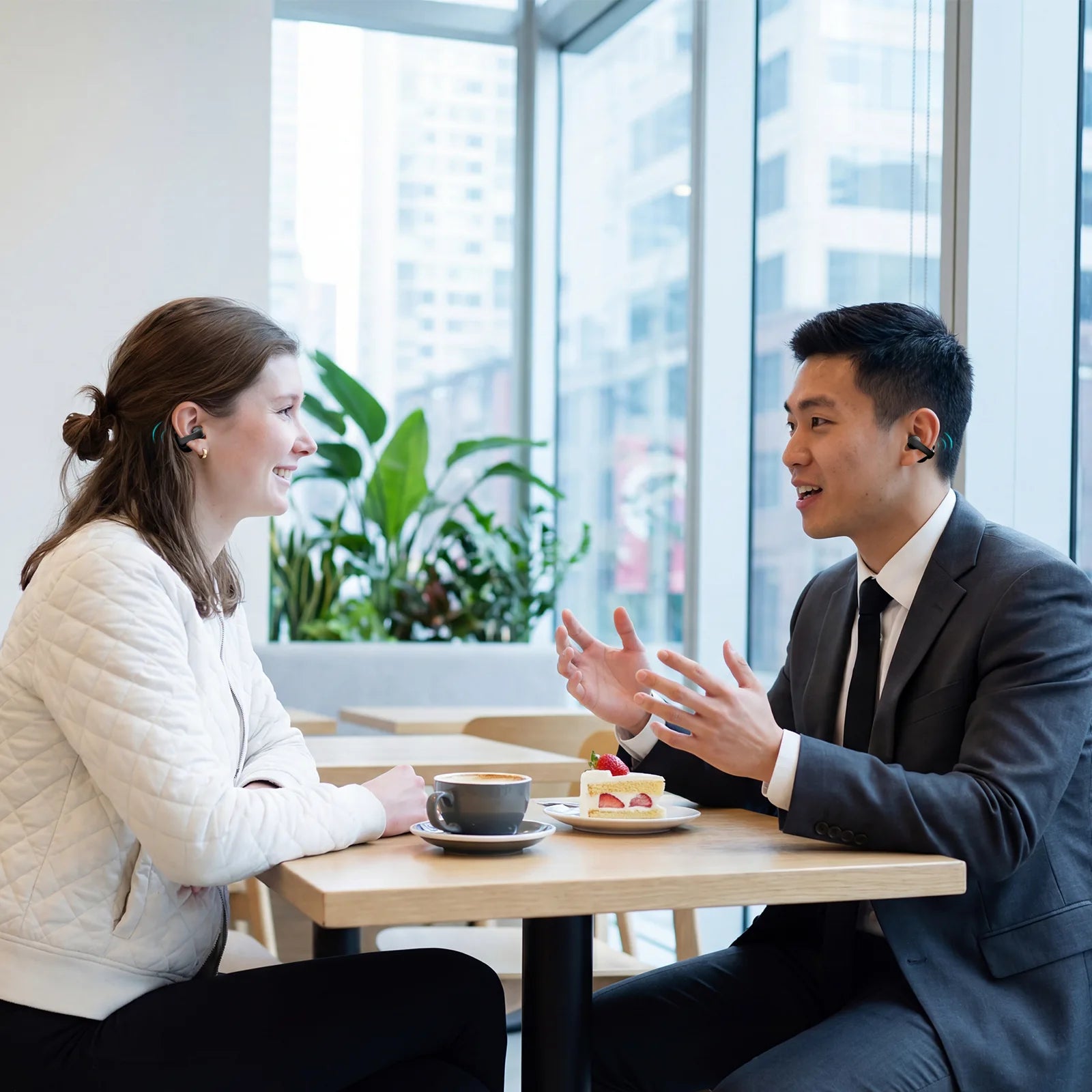 Real-time two-way translation - just pop in an earbud each and chat naturally. No more language barriers.