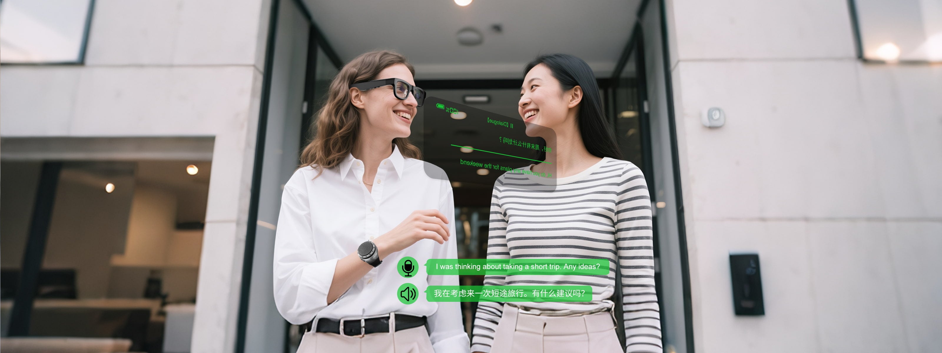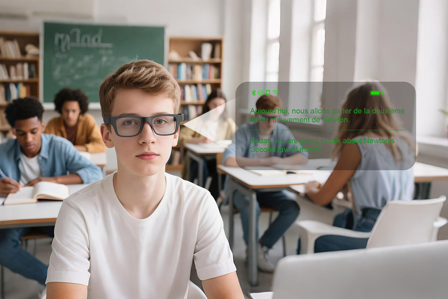 Spoken words are translated and transcribed into real-time captions that appear directly in your field of view. Ideal for conferences, university lectures, or busy public spaces — so you can follow every word with confidence.